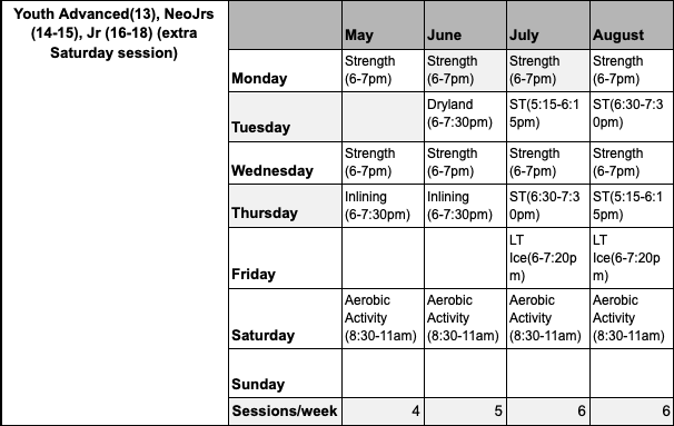 The club Youth Advanced (13), Neo Jrs (14-15), Jr (16-18) summer programming will run Monday, May 4th, through Friday, August 21st